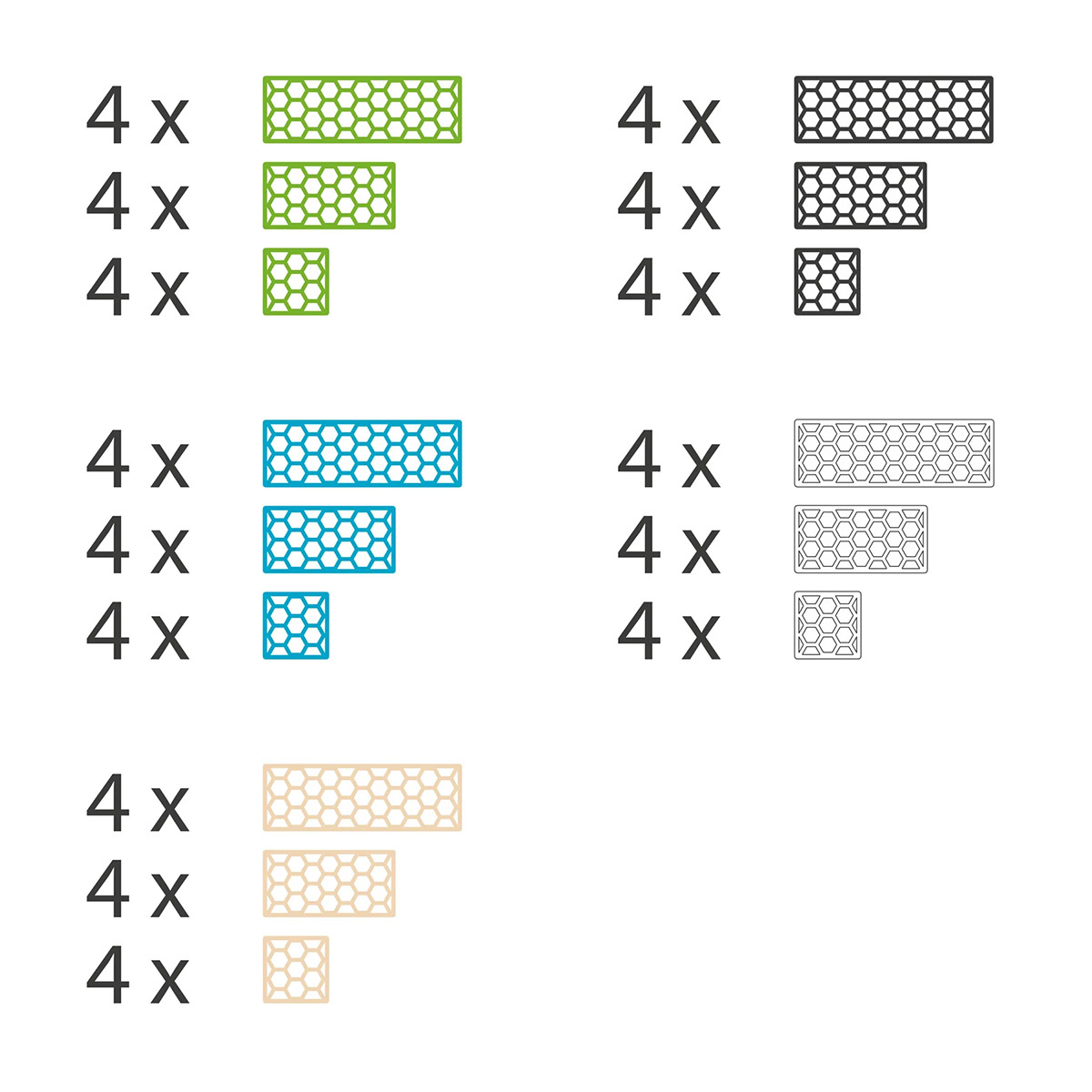 De uitbreidingsset “Sunshine” bevat blauwe, groene, beige, zwarte en witte BiTS met de volgende afmetingen: