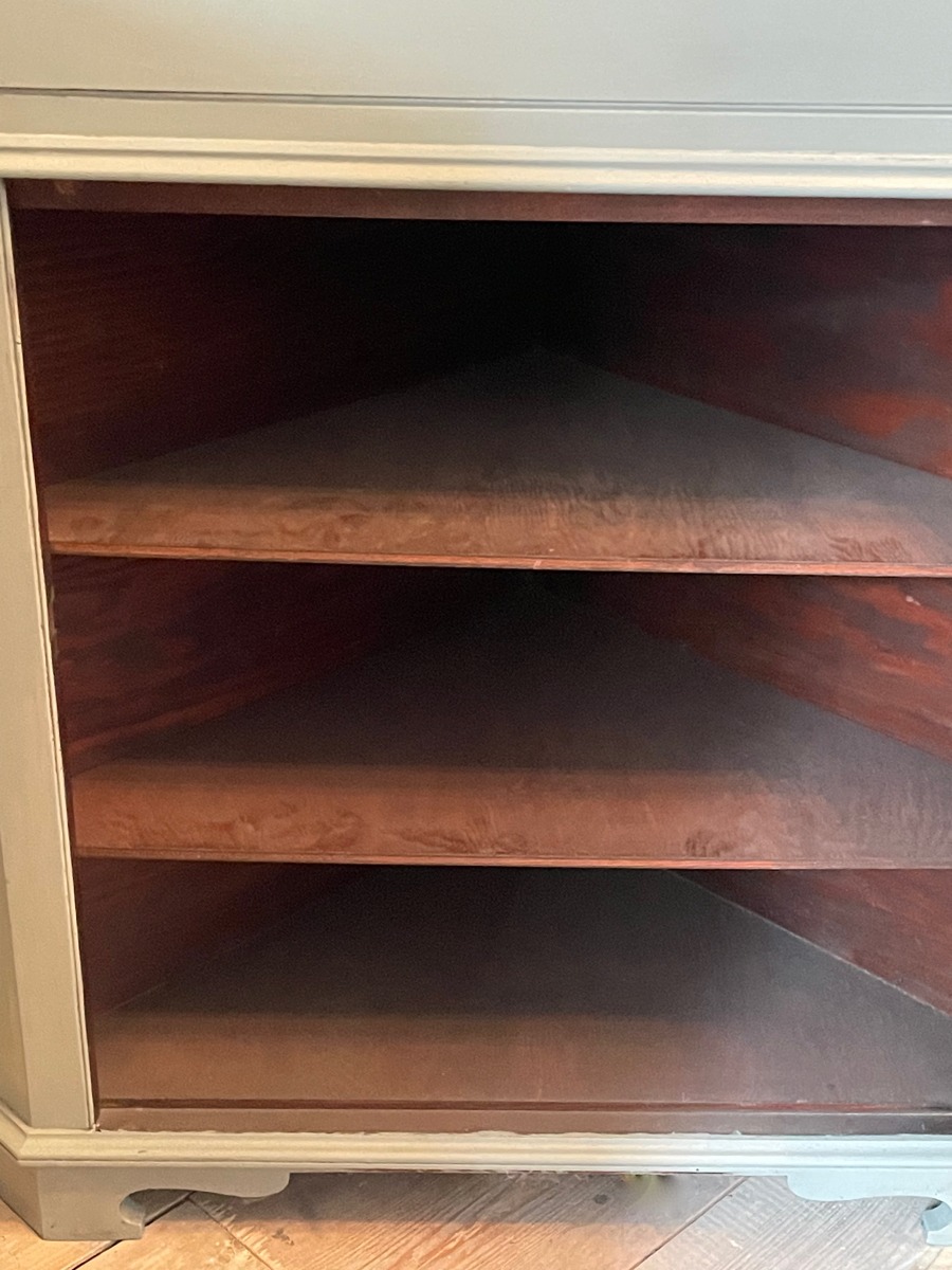 Deze prachtige antieke / brocante hoekkast is vakkundig geschilderd in een subtiele grijstint met een vleugje olijfgroen, wat zorgt voor een tijdloze, stijlvolle look. De kast is 207,5 cm hoog en heeft een hoekmaat van 57 cm aan beide zijden, met een bovenzijde van 89 cm breed. Perfect voor elke ruimte waar je op zoek bent naar functionele charme!