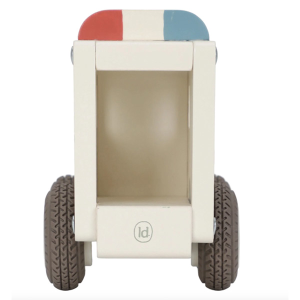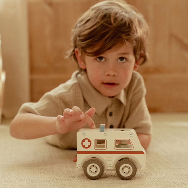 Sirene aan, tijd om te helpen! Deze houten ambulance met rubberen wielen brengt patiënten snel naar het ziekenhuis. Binnenin is ruimte voor een patiënt en de set bevat een houten verpleegkundige. Rij zo snel mogelijk naar het noodgeval, breng de patiënt naar binnen en zorg goed voor iedereen. Dit ambulance speelgoed maakt rollenspel nóg leuker. Help jij vandaag iemand beter worden?