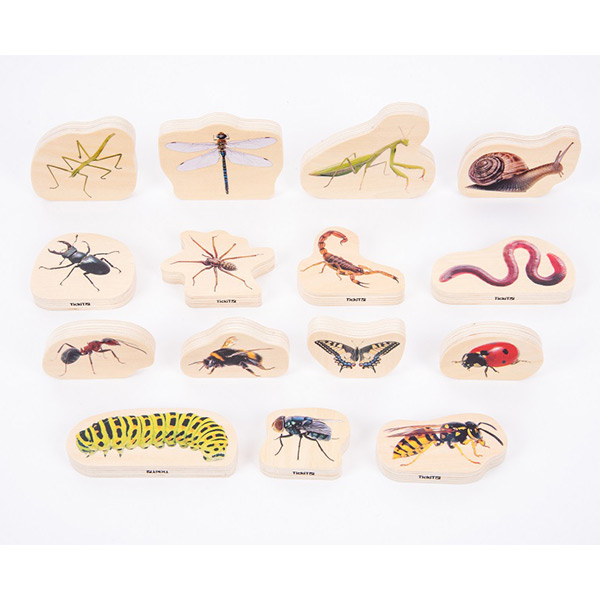 Dikke en lichtgewicht houten blokken van berkenmultiplex, aan beide zijden in kleur bedrukt met echte afbeeldingen van vijftien insecten. Ideaal voor jonge kinderen om fantasierijk te spelen.