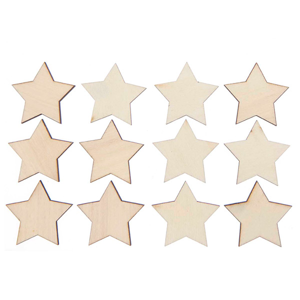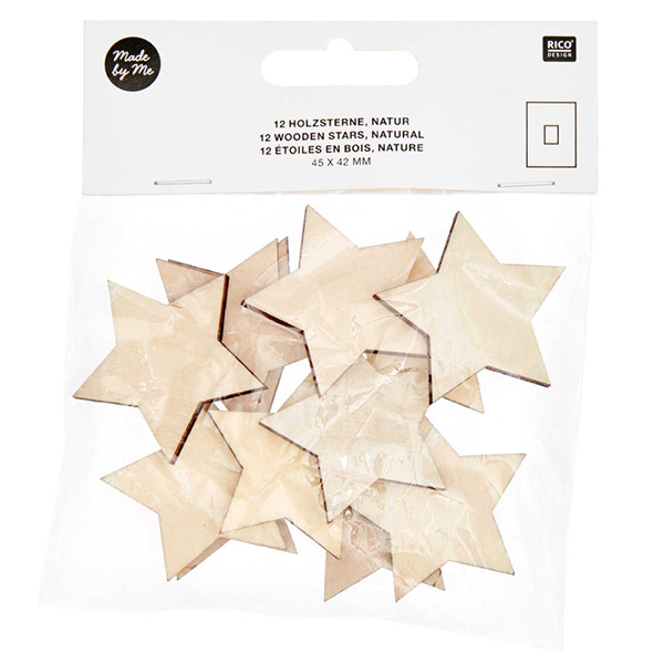 Een zakje met 12 houten sterren. Je kunt de sterren gebruiken voor looseparts, voor rekenactiviteiten, taalactiviteiten, om mee te knutselen, enz.