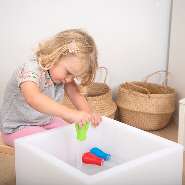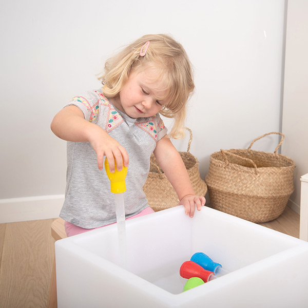 Jumbo pipetten met felgekleurde knijpbollen en maatmarkeringen op de druppelaar. Een leuke toevoeging aan het zand- en waterspel.