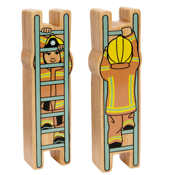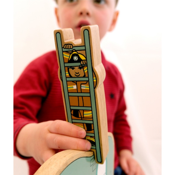 Een stevige houten ladder met brandweerman, perfect voor kleine handjes.