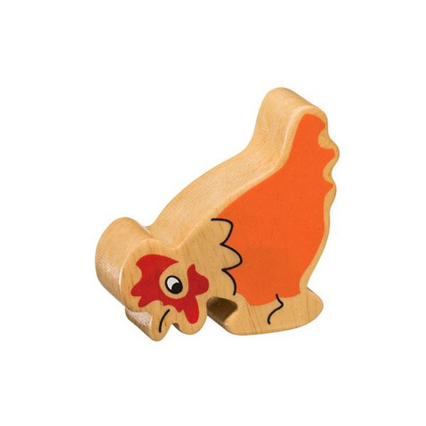 Een kleurrijke, stevige houten kip, perfect voor kleine handjes.