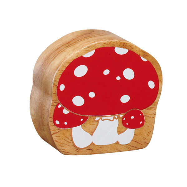 Een stevige houten paddenstoel, perfect voor kleine handjes.