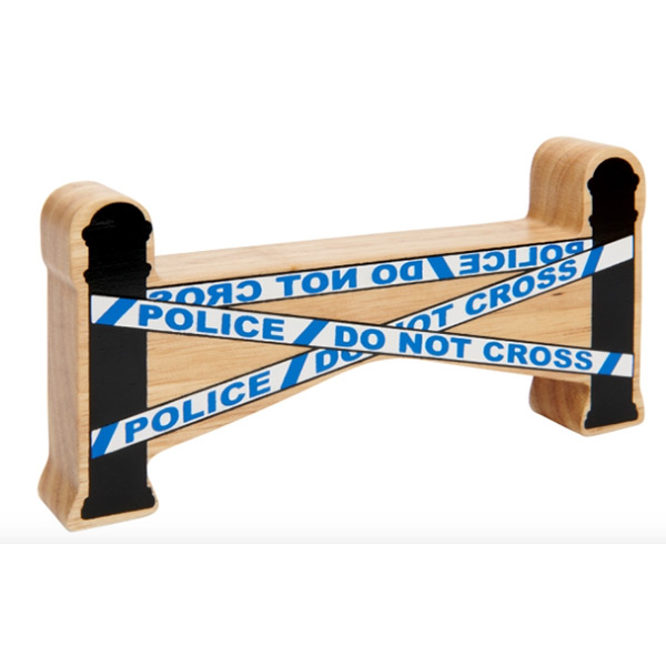 Een stevige houten politie versperring, perfect voor kleine handjes.