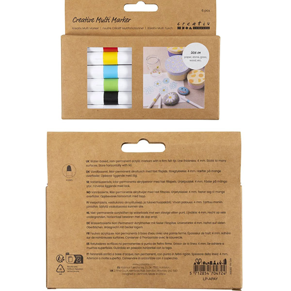 Niet-permanente acrylstiften op waterbasis met volle kleuren en een stevige vilten punt. Je kunt de stiften gebruiken op steen, papier, canvas, glas, porselein, plastiek, hout, karton en metaal. Makkelijk afwasbaar.