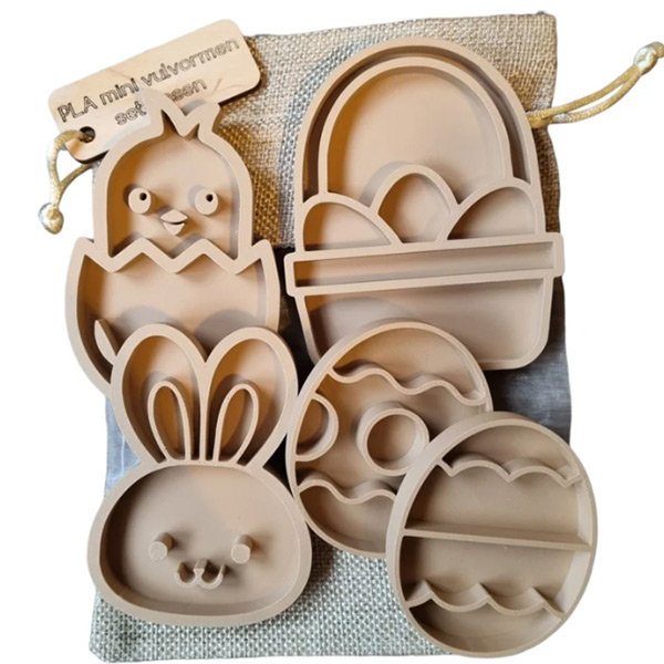 Vijf PLA vulvormen Pasen (Een kuiken, paasmand, konijntje en 2 paaseieren). Perfect te vullen met droge items zoals speelrijst / speelparels. In een lekker klein en handig formaatje.