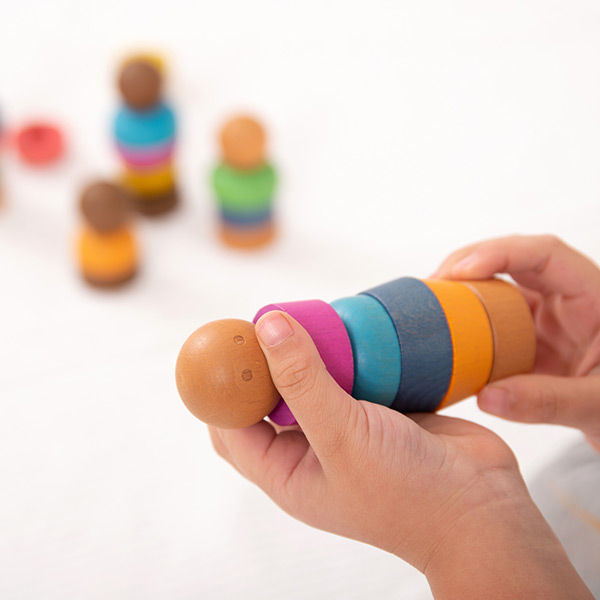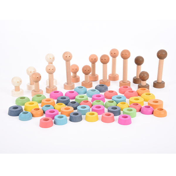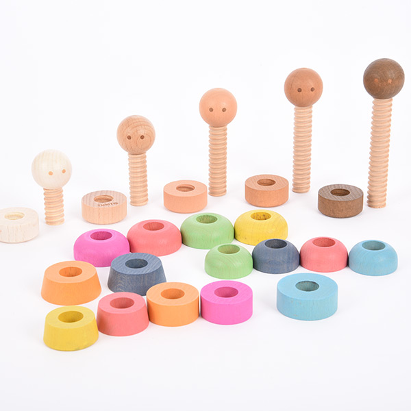 Vijftien houten poppetjes – De houten regenboog poppetjes schroef je in elkaar. Elk poppetje heeft als basis een kop met een lange houten schroef.