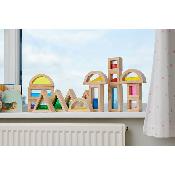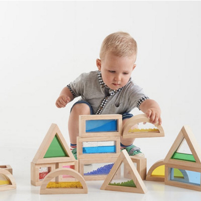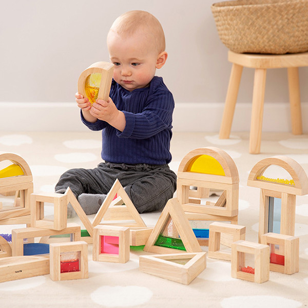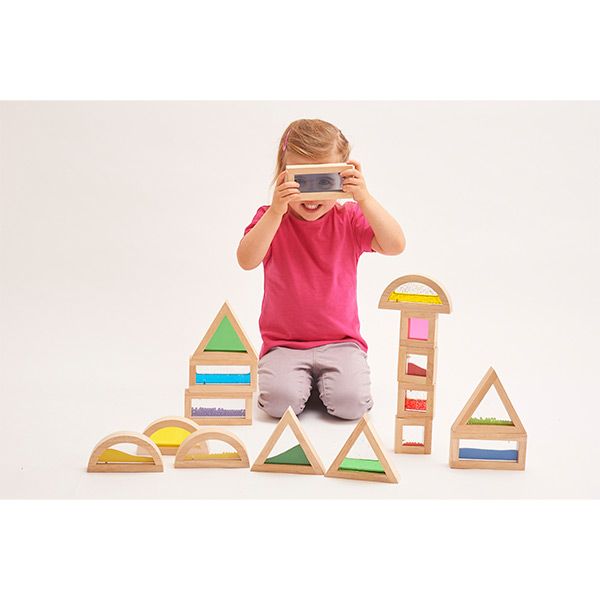 Zestien rubberhouten sensory blokken met kralen, transparant acryl, gekleurd zand en met water/glitter gevulde vakken in 4 verschillende vormen (vierkant, rechthoek, driehoek en halve cirkel).