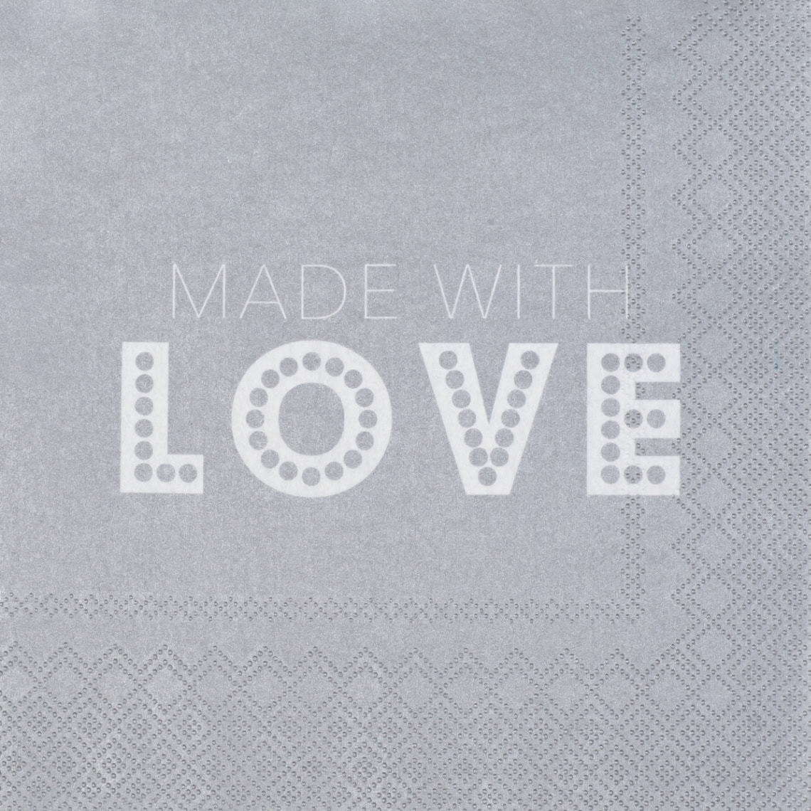 Een pakje van 20 leuke papieren servietten van het design-merk Räder. Deze grijze servietten zijn bedrukt met de tekst ‘MADE WITH LOVE’.