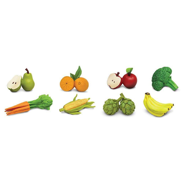 Een set met diverse fruit & groenten, waaronder een peren, sinaasappels, appels, artisjokken, wortelen en bananen, evenals broccoli en maïs.