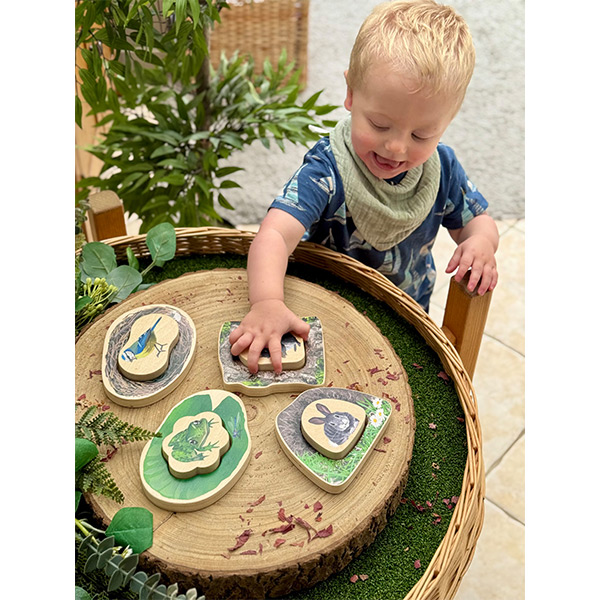 Het buitenste stukje toont een scène uit de leefomgeving, terwijl het binnenste stukje de leefomgeving compleet maakt of omgedraaid kan worden om het verborgen dier te onthullen! Kinderen ontwikkelen hun fijne motoriek en hand-oogcoördinatie terwijl ze een vogel in een nest plaatsen, een kikker op een lelieblad, een konijn in een hol en een eekhoorn in een boom.